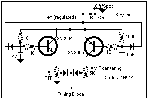 The SPDT switch (front panel) attaches the key lines either to the system keying line, or directly to ground. When grounded, you RX and TX on the same frequency for SSB or for spotting a CW signal to zero beat. When in the other position, you have receive offset for a CW beat note, or for RIT in SSB or CW.